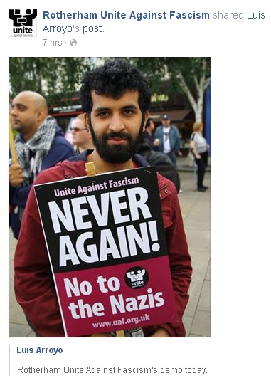 On Saturday an Anti Islam protest group called ''Britain First'' marked the first anniversary of the breaking of the Rotherham grooming scandal by holding a street march in Rotherham. This blog is no friend of the Counter Jihad movement, but it is always heartening to see normal white British people take to the streets and