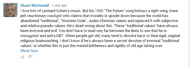 Mr. Cohen keeps the Sabbath even while on tour and performed for Israeli troops during the 1973 Arab-Israeli war. So how does he square that faith with his continued practice of Zen? "Allen Ginsberg asked me the same question many years ago," he said. "Well, for one thing, in the tradition of Zen that I've practiced, there is no prayerful worship and there is no affirmation of a deity. So theologically there is no challenge to any Jewish belief."[100]And so, here we have a deeply Jewish song writer with, it has to be said, an impressive intellect, giving us his vision of ''The Future'' as seen from 1992. And from the perspective of 2015 it has to be said, he was bang on the money in every respect. Here are the lyrics with some thoughts of my own, a more thorough investigation which is very heavy on the religious undertones can be read here.