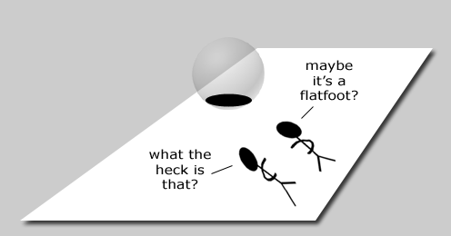 In their world view Nazis equate to evil, so having established that the EU, political correctness and Muslim immigration is evil they have, logically to them, concluded that somehow Nazis must be involved, even when what they regard as the new evil runs diametrically against everything the Nazis stood for. The two figures in the picture above represent our cuckservatives, the EU and Muslims, say, are the sphere, but living in their Flatworld they can only see the bottom of the sphere, and are drawing their conclusions from that.