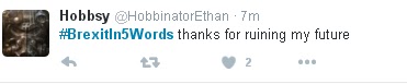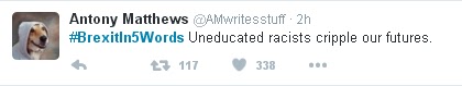 The histrionics of the 'remain' losers is already the stuff of legend, there's no handshake and ''well played sir' there's no 'oh well, that's democracy' what we are seeing is borderline psychopathy as these spoiled, self entitled, narcissistic, effeminate drones throw, not just their toys out of the pram, but the pillows and sheets and milk bottle too.