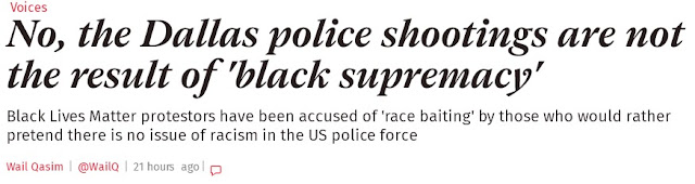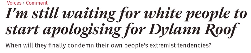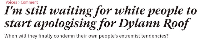 Qasim dedicates precisely one sentence! to the shot White policemen before pushing the Black Lives Matter narrative. So how did The Independent report on Roof? did they throw out a few words on the dead Blacks and then continue to rail against the rape of White women and working class Whites becoming marginalized? of course not, the writer tediously drags out the 'White murderers are terrorists' meme for an entire article: