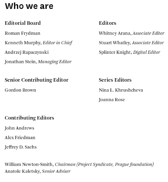The purpose of Project Syndicate appears to be to establish a Globalist line and then have it trickle down into the main stream media and national governments which they see as not more than regional satraps: